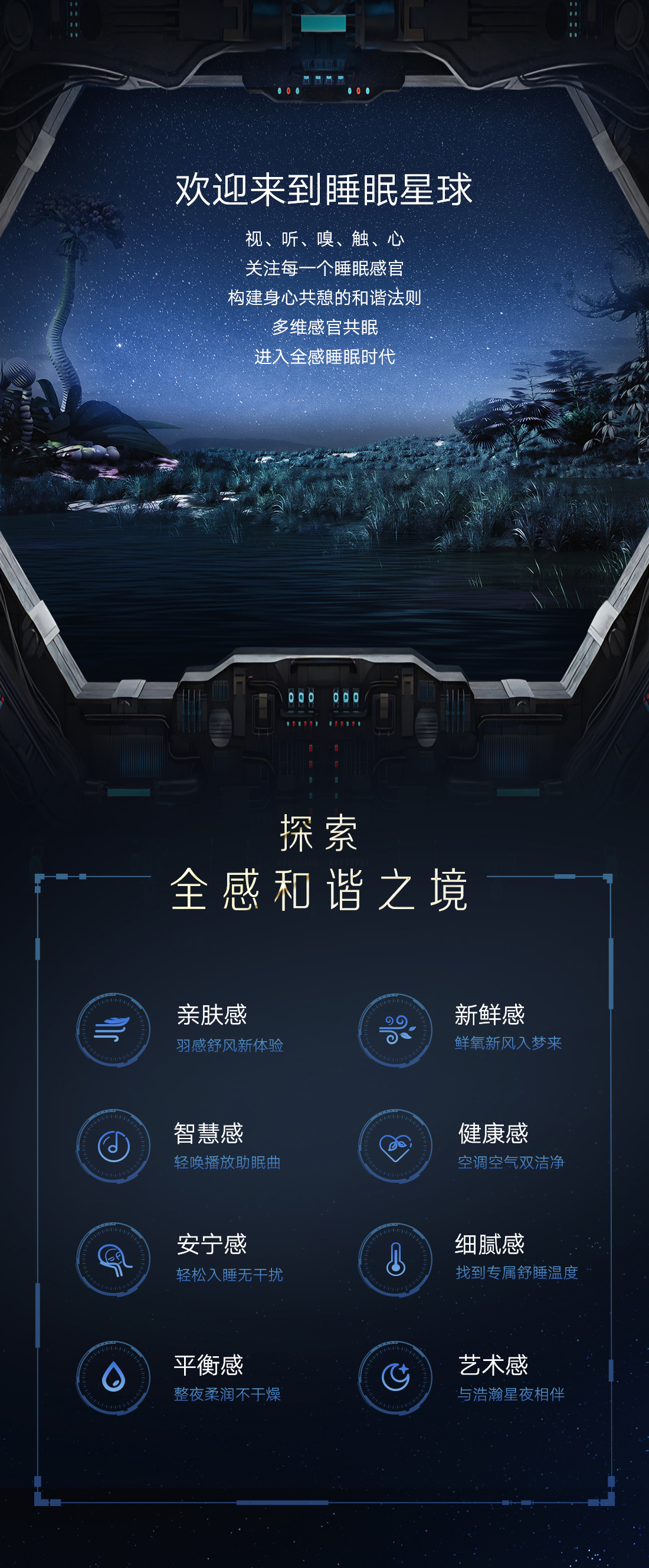 欢迎来到睡眠星球!格力睡眠空调“星”升级,格力·星宇空调关注视、听、嗅、触、心每一个睡眠感官,构建身心共憩的全感和谐之境。
